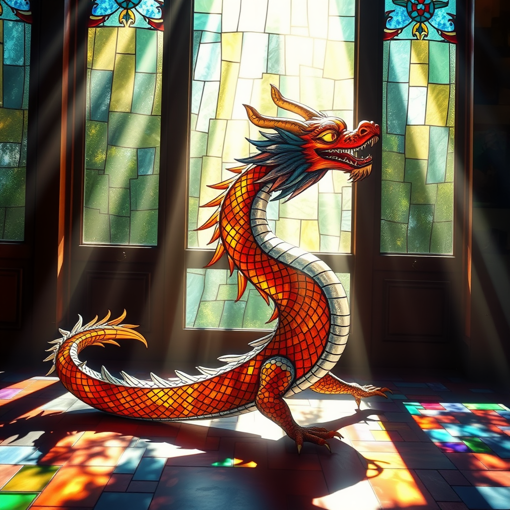 A dynamic digital painting of a vibrant stained glass art piece depicting a majestic Chinese dragon in a swirling, elegant pose. Sunlight streams through the window, casting colorful patterns on the floor, highlighting the dragon's intricate scales and sinuous form. The composition is finely detailed, with each piece of glass meticulously crafted to enhance the dragon's mythical features. The scene is captured in ultra-high resolution, offering sharp focus and cinematic depth, with the dragon appearing almost lifelike as its eyes glimmer mysteriously. The entire artwork exudes a sense of timeless beauty and awe-inspiring craftsmanship.