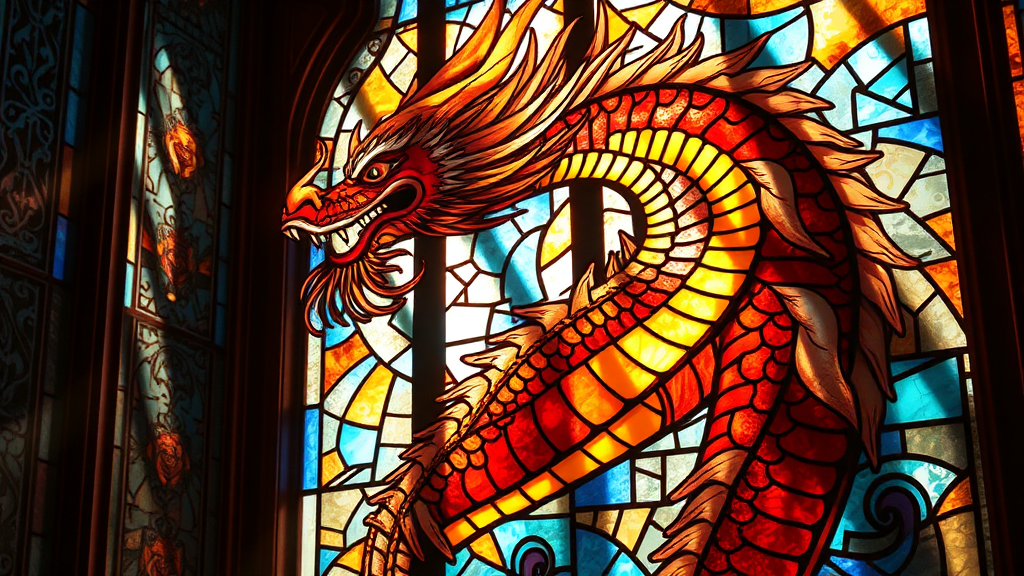 A dynamic digital painting of a vibrant stained glass art piece depicting a single regal Chinese dragon, intricately detailed with elegant, curling scales and fiery eyes. Sunlight streams through the stained glass, casting colorful patterns that dance across the room, emphasizing the dragon's fluid, graceful pose. The ultra-high-resolution scene captures the stunning artistry, with sharp focus and cinematic depth, evoking a sense of awe and reverence.