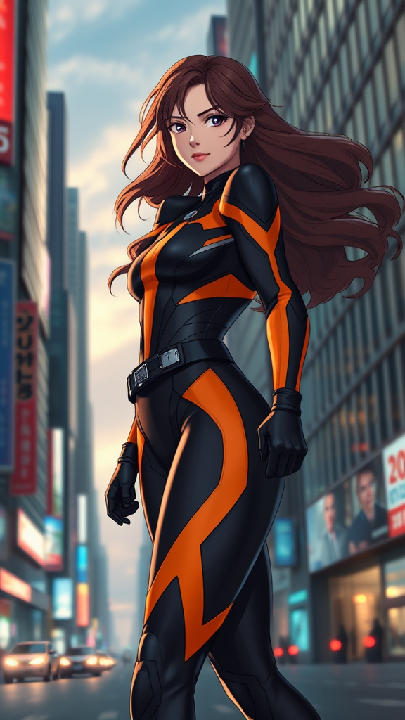 A dynamic, full-body depiction of a female superhero in a bustling urban landscape, showcasing her flowing long wavy hair and an eye-catching black and orange suit. The scene is rendered in sharp focus with 8k quality, capturing the essence of anime-inspired artistry from the likes of Studio Trigger, Makoto Shinkai, and Studio Ghibli. Volumetric lighting highlights her form, casting soft shadows that enhance the cinematic style. The setting is at dusk, with the city aglow in the twilight, as she strikes a fearless pose. The character is detailed with precision, void of any visual distractions such as text, watermarks, or errors in anatomy, ensuring a seamless representation of heroism and elegance.
