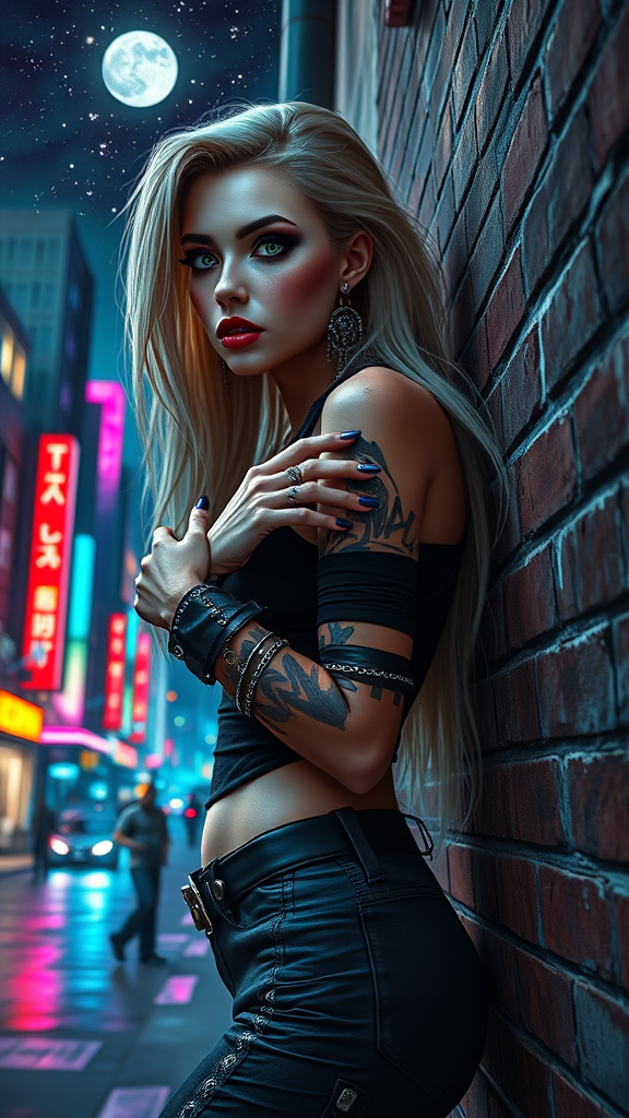 A dynamic full-body portrait of a cyberpunk woman leaning against a brick wall on a bustling cyberpunk city street at night. The scene is illuminated by vibrant city lights and colored lighting, set against a starry sky with a bright moon. The woman has a striking appearance, featuring long blonde hair and a detailed symmetrical face. She embodies a punk aesthetic with an edge—wearing long sleeves, multiple bracelets, rings, and flaunting ear piercings along with reflective eyes and makeup. The wall behind her is adorned with graffiti, adding to the gritty urban vibe. The lighting is dramatic, with detailed chiaroscuro and rim lighting effects that highlight her form. The overall composition is reminiscent of a professional majestic impressionism oil painting, evoking influences from artists like Waterhouse, John Constable, and Jeremy Mann. The artwork is trending on platforms like ArtStation and CGSociety, showcasing intricate detail and high artistry with a touch of surrealism, as seen in Studio Ghibli's works or Makoto Shinkai's vibrant cityscapes. This scene captures the essence of a futuristic city with a strong, alt woman confidently owning her space, free from any imperfections or distortions.