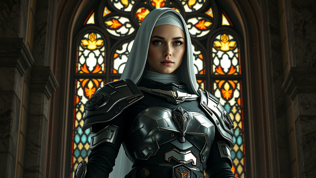 A dynamic full-body portrait of a devout woman warrior, standing confidently in front of an intricate stained glass window. A beautiful sister of battle, she embodies the spirit of valor, with a face that is symmetrically detailed and reflective eyes, framed by dark eyebrows and accentuated by subtle makeup. Clad in sci-fi nun armor, she is poised in an environment with marble walls, illuminated by dramatic, detailed lighting that includes rim lighting and chiaroscuro, lending an atmosphere of reverence and intensity. This scene is inspired by the artistic styles of Warhammer 40k, featuring the majestic impressionism of a professional oil painting by masters such as Waterhouse, and the atmospheric storytelling of Studio Ghibli. The artistry encapsulates the grandeur of John Constable's landscapes, the dramatic flair of Jeremy Mann, and the intricate details of Greg Manchess, trending on platforms like ArtStation and CGSociety. The composition is intricate and high detail, with influences of Makoto Shinkai's Kyoto, creating an epic, immersive piece in a scene filled with dust particles, capturing the essence of battle and faith without any imperfections or distortions.