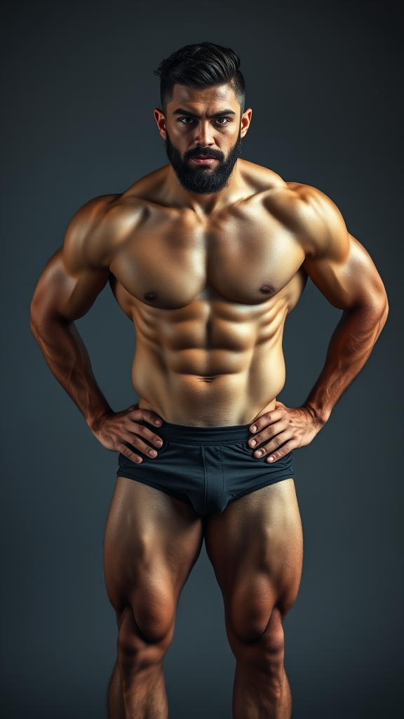 A dynamic full-length portrait of an athletic and strikingly handsome Cuban man, captured with award-winning cinematography and photography. He stands confidently, showcasing his entire body with a wide field of view. His tall, powerful stance is complemented by a masculine build, defined muscles, and a very hairy chest. His asymmetrical eyes add an intriguing charm to his chiselled features. He sports a beard stubble, emphasizing his rugged appearance. His strong shoulders and solid abs are highlighted, and he poses to showcase his fit physique, including his well-toned legs, all presented in a photo-realistic style.