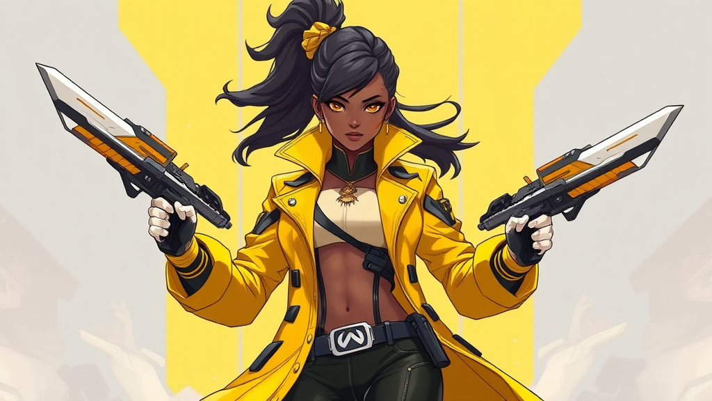 A dynamic, futuristic woman in a striking yellow coat, dual-wielding sleek weapons, exuding the confident poise of a legendary hero. She embodies the spirit of Overwatch, with a design echoing the boldness of apex legends and valorant. Her aesthetic fuses Brigitte's strength with Loba Andrade’s allure, brought to life in a vibrant afrofuturism anime style. With the agility of Lucio reimagined as a woman, she stands ready for battle, merging elegance and power like Senna from league of legends, masterfully blending these influences into a groundbreaking character concept.