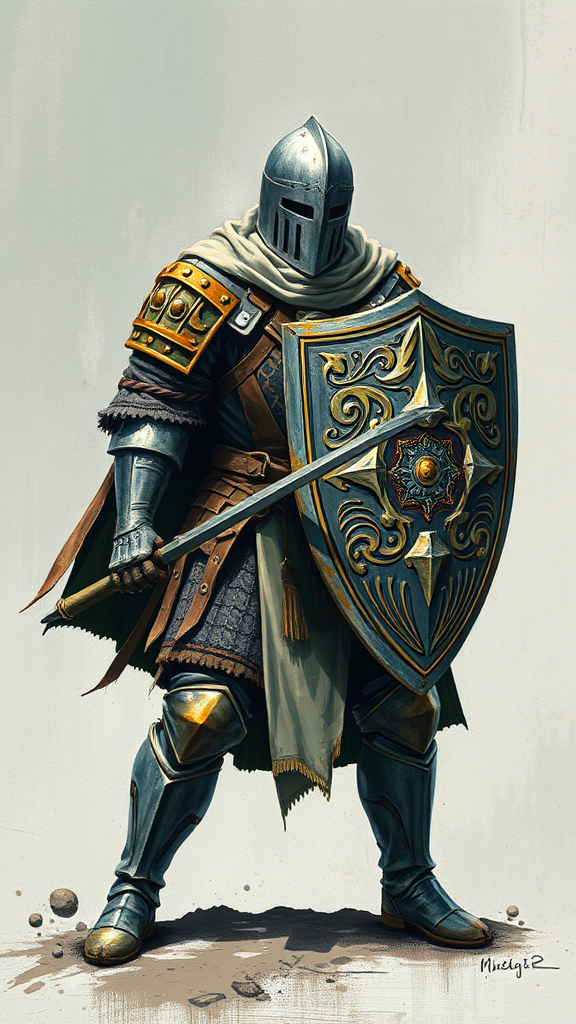 A dynamic illustration of a brave knight, clad in an intricately patterned cloak and carrying a formidable shield, designed with a flair reminiscent of adventure pulp covers. The artwork features a dark white and bronze color scheme, with a mottled texture that evokes the spirit of Yup'ik art. The piece employs heavy use of palette knives to create a rich, textured appearance, with subtle accents of light indigo and green woven throughout. The style blends the bold, graphic qualities of 1970s artwork with a contemporary touch, capturing the essence of a timeless hero in a tall, narrow composition.