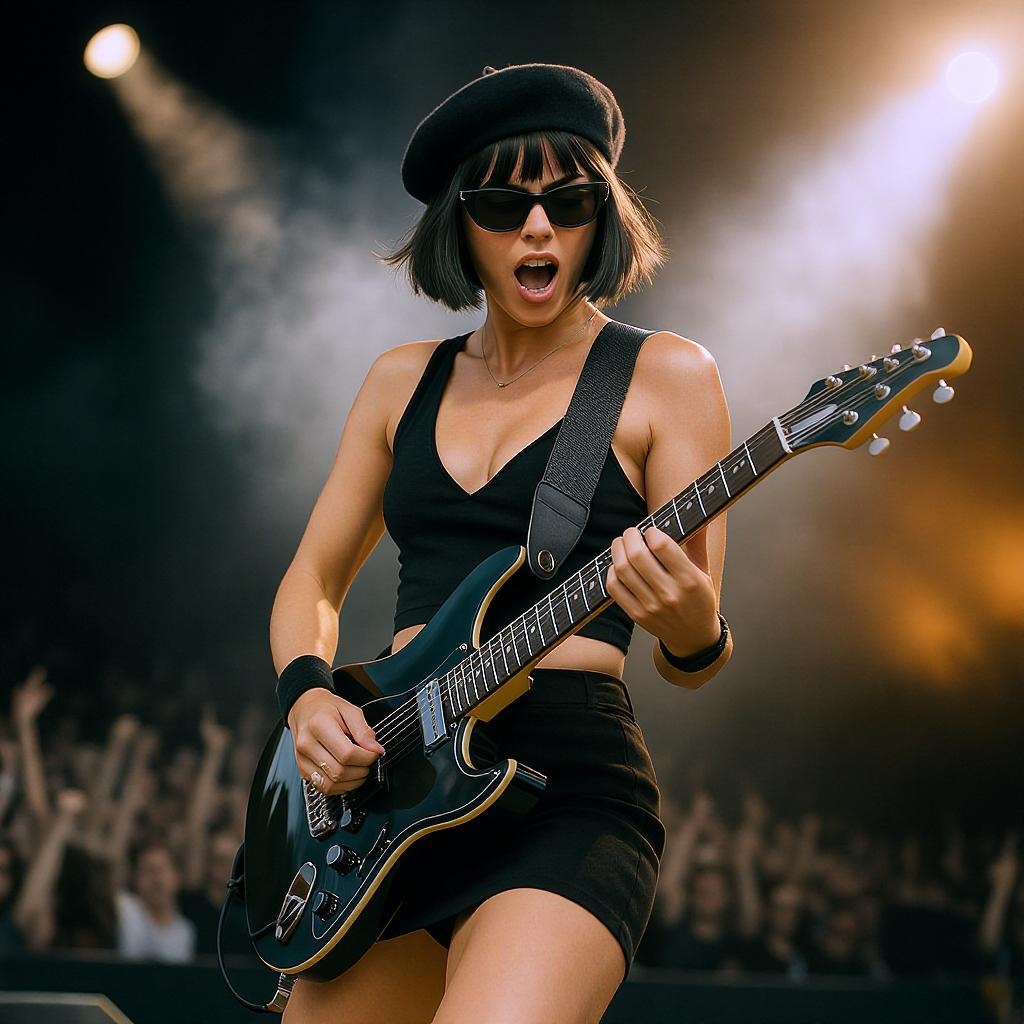 A dynamic image captures a woman with a sleek angled bob haircut passionately performing an intense electric guitar solo, fully absorbed in the vibrant energy of the crowd. She wears a stylish black beret, trendy dark sunglasses, a sleek black fitted V-neck crop top, and a form-fitting miniskirt. It's a sunlit day, and she's center stage at an outdoor concert, leaning forward into the moment. Brilliant stage lights create a powerful halo effect behind her, enhancing the drama and intensity of her performance.