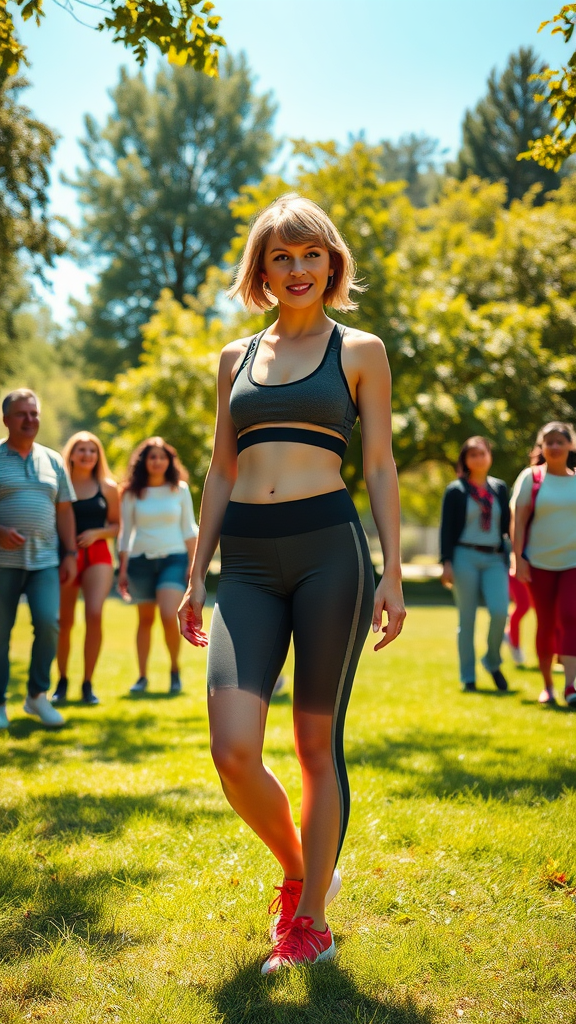 A dynamic image captures Taylor Swift in a chic workout outfit, standing confidently in a sunlit park. With a background of lush greenery, the photo conveys a vibrant and energetic feel. The ultra high resolution emphasizes the details of the scene, casting a natural shadow across the soft grass. Photographed with a Canon EOS R6 using a 135mm lens, settings include 1/1250s, f/2.8, and ISO 400. The image captures her captivating expression and highlights her poised stance, all while ensuring a positive, engaging atmosphere with diverse individuals in the background, sharing smiles and laughter under the clear blue sky.