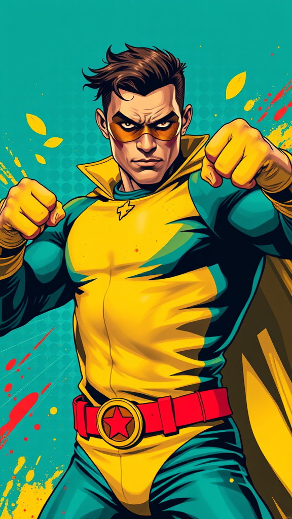A dynamic image depicts a man clad in superhero attire, his fists and arms striking a powerful pose, embodying the vibrant essence of chicano art. The design is awash with a palette of dark yellow and turquoise, accentuated by vivid splashes of red and bronze. The composition mirrors the boldness of classic poster art, infused with elements of rangercore and influenced by the aesthetic of argus c3 and the avant-garde spirit of the blue rider movement.