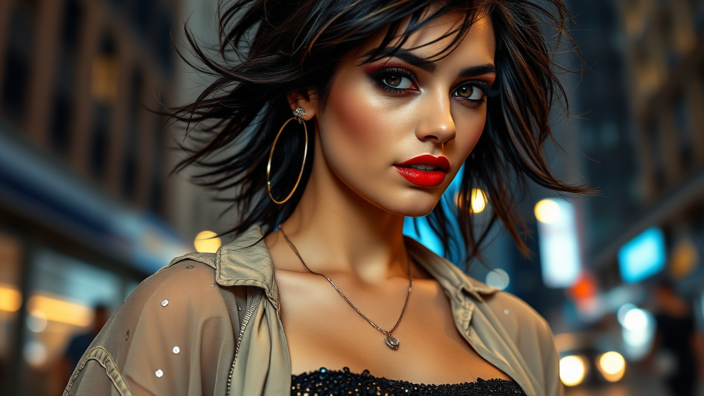 A dynamic medium close-up of a vivacious young woman with tousled raven hair, adorned in a chic sequined crop top and a casually open blouse. She sports bold hoop earrings and a delicate necklace, her attire reflecting the aftermath of a spirited night out. Her lips are painted with a striking shade of lipstick, complemented by shimmering dark eye shadow that highlights her vibrant eyes. Radiating an energetic aura, she stands in the city under the late night sky, where intricate details bring her animated presence to life against an urban backdrop. The contrast is heightened, capturing the meticulous texture of her skin and the sparkle in her eyes, a true masterpiece of life and style.