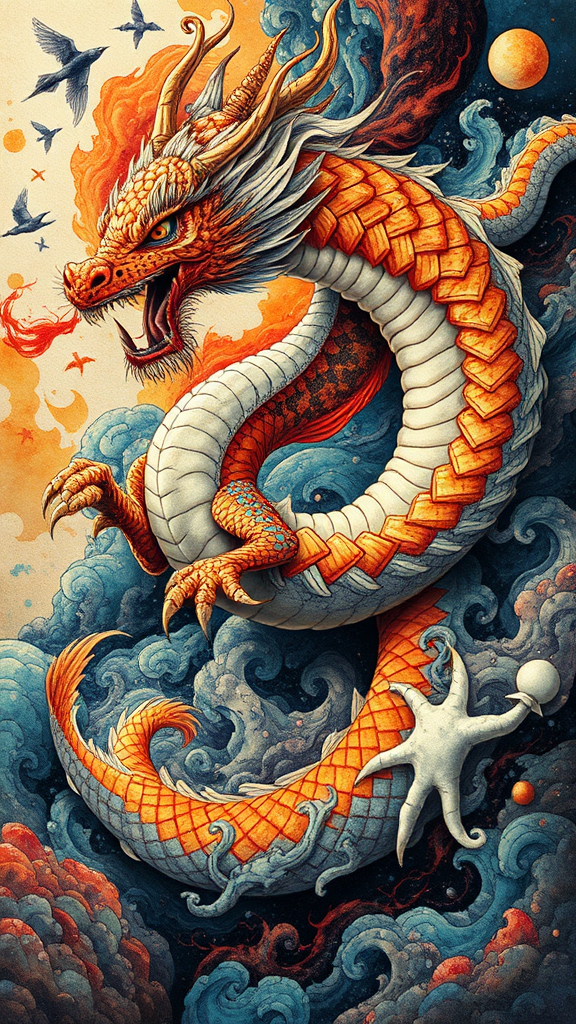 A dynamic multicolored dragon swirling through a vibrant scene, blending influences of Shohei Otomo's detailed line work, Brian Mashburn's atmospheric depth, and Natalia Rak's bold color contrasts. The dragon exudes spontaneous energy, with textures reminiscent of encaustic artistry, and patterns inspired by hurufiyya calligraphy. Its scales ripple like marbleized ink, creating a sense of fluid motion and ethereal beauty. Surrounding the dragon, a dreamlike landscape merges elements of fantasy and abstraction, inviting the viewer into an otherworldly encounter.