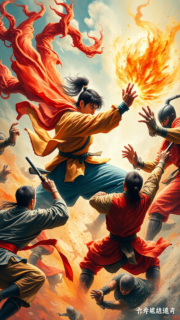 A dynamic painting depicting an epic Chinese Kung Fu scene, featuring a master martial artist taking on a group of opponents. The artwork captures the intensity and grace of the fight, with swirling energy flows and a vibrant palette. Intricate details highlight the skill, agility, and explosive power of each movement, reminiscent of a Jaime Jones style with a 50mm lens perspective --ar 16:9 --c 7 --s 250.