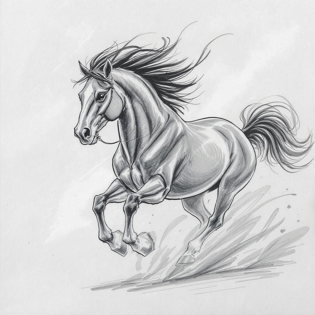 A dynamic pencil drawing of a galloping horse, characterized by bold, fluid strokes and expressive facial details. The artwork features large, sweeping lines and loose, animated brushwork that capture the spirit and movement of the animal. The style is reminiscent of calligraphic gestures, highlighting the character and vitality of the horse through raw, emotive strokes. The overall composition conveys a sense of energy and freedom, with an emphasis on gestural, flowing lines.