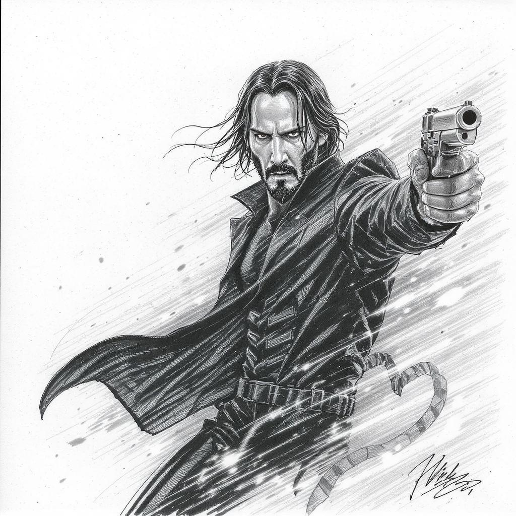 A dynamic pencil sketch of Keanu Reeves as John Wick, poised in an intense action stance with his gun drawn and eyes focused, exuding a fierce determination. His silhouette is elongated, capturing the essence of movement, with details highlighting the rugged textures of his tactical suit. The overall composition balances realism with stylistic flair, emphasizing his iconic long hair and stern expression, set against a subtle backdrop that suggests motion and urgency.