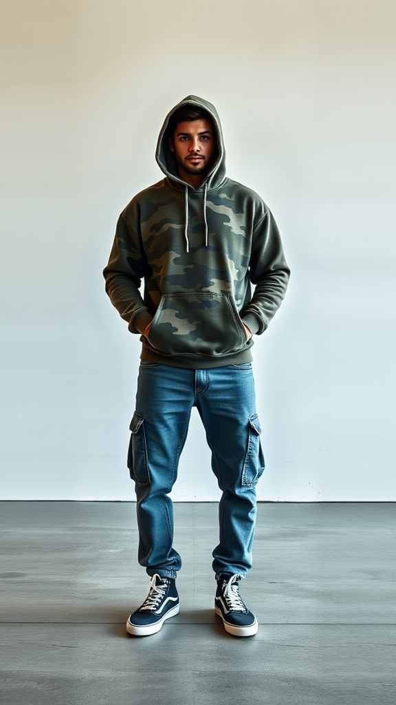 A dynamic photograph captures a full-body portrait of a male model in a front pose, wearing a camouflage-colored, loose-fit hoodie paired with denim cargo pants and Vans sneakers. Shot with a Sony α9, the model stands in a minimalist open space, surrounded by a blur of motion that contrasts with his stillness. The background is a plain wall with subtle texture, emphasizing the rich details of the motion effect around him. The scene is set in an elongated 9:16 aspect ratio, with a raw, artistic style elevated by a touch of stylization.