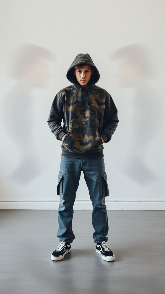A dynamic photograph featuring a male model in a front-facing, full-body pose, enveloped by a swirling blur of motion. He wears a loose-fitting camouflage hoodie and faded denim cargo trousers, paired with classic Vans sneakers. Captured with a Sony α9 camera, the scene unfolds in a minimalist open space, the plain textured wall serving as an understated backdrop. This setting subtly contrasts with the transient silhouettes around him, emphasizing the rich detail in the model's attire and stance. The image prioritizes a raw and candid style, with a focus on the stark interplay between stillness and motion.