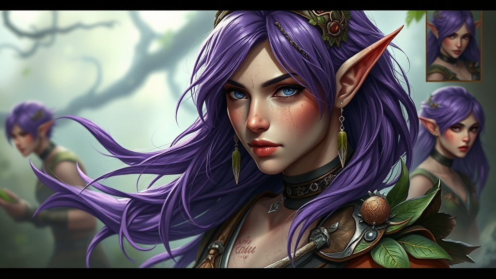 A dynamic portrait of a female elf druid with vibrant purple hair, adorned with intricately detailed plant-infused gear epitomizing RPG fantasy art. The scene is enveloped in soft volumetric lighting and atmosphere, capturing photorealistic qualities in high resolution. She strikes a dynamic pose, her dirty face and long neck conveying a rugged elegance. Delicate earrings dangle from her pointed ears. Despite some minor imperfections like text artifacts and blurriness, the image radiates epic fantasy charm. The character sheet includes multiple views, providing a comprehensive glimpse of her persona. Elements like artist signature or watermark are subtly present but unobtrusive.
