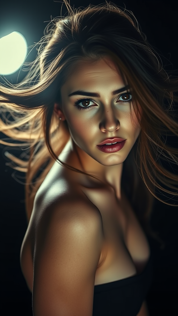 A dynamic portrait of a strikingly beautiful 30-year-old woman with a slender, athletic build and a captivating face, framed by a dramatic, contrasting background. Her expression is a mix of frown and innocence, with her hair flowing under intense, backlit conditions that emphasize a mysterious, horror-like atmosphere. The shot employs a cinematic style, photographed from a low angle with a DSLR, using aperture f/7, shutter speed 1/100 sec, and ISO 150. The image is hyper-detailed and photorealistic, showcasing natural reflections and cinematic anime-style lighting. The setting is immersive, featuring elements like symmetry and bright light. The woman's appearance is unmarred by common artistic flaws, ensuring the focus remains on her elegance and the haunting ambiance of the scene.