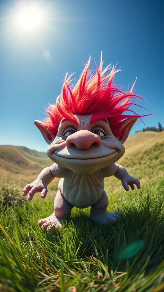 A dynamic portrait of a troll captured with a fisheye lens, set against a vibrant, sunlit grassy terrain dotted with rolling hills under a clear blue sky, showcasing the troll's textured skin and quirky features in bright, lively colors.