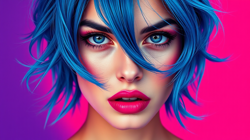 A dynamic portrait of a woman with electric indigo hair, blending the essence of Andy Warhol and Richard Avedon. The image features vibrant pop art colors and clean graphic lines, paired with a high-contrast, minimalist photographic approach. Her face is intricately detailed, with an intense and captivating gaze. Set against a vivid, complementary background, the piece embodies the essence of iconic and modern pop culture while maintaining a contemporary flair.