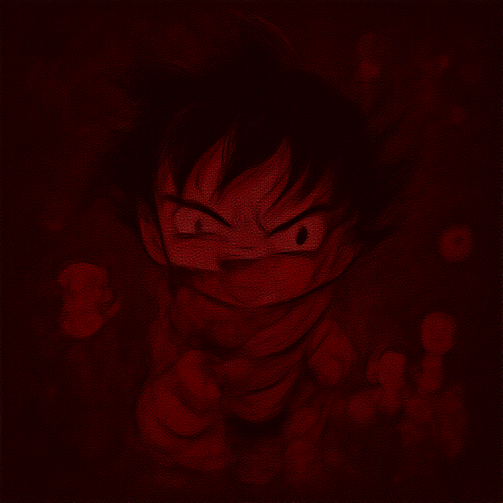 A dynamic portrait of Goku in a street art aesthetic, blending cute cartoonish designs with photorealistic techniques. The piece features dark red hues, evoking a sense of childhood arcadias with an anime aesthetic. Cartoon-like figures and vibrant elements capture the playful essence of the character, reimagining Goku's youthful energy in a 1:2 aspect ratio.