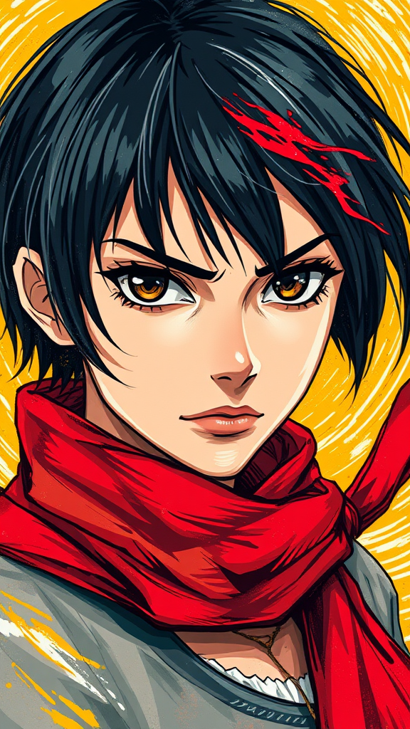 A dynamic portrait of Mikasa Ackerman painted in the expressive style of Vincent van Gogh, capturing her intense and determined expression with swirling, textured brushstrokes. Her dark eyes convey a fierce resolve, and her short black hair is depicted with vibrant streaks of color that echo Van Gogh's energetic technique. She wears a bold red scarf that flows dynamically around her, contrasting with the warm, swirling yellows of the background. The anime influence is evident in the stylized features and extreme detail, while creative touches include subtle hints of movement in the air around her, suggesting an underlying tension and energy.