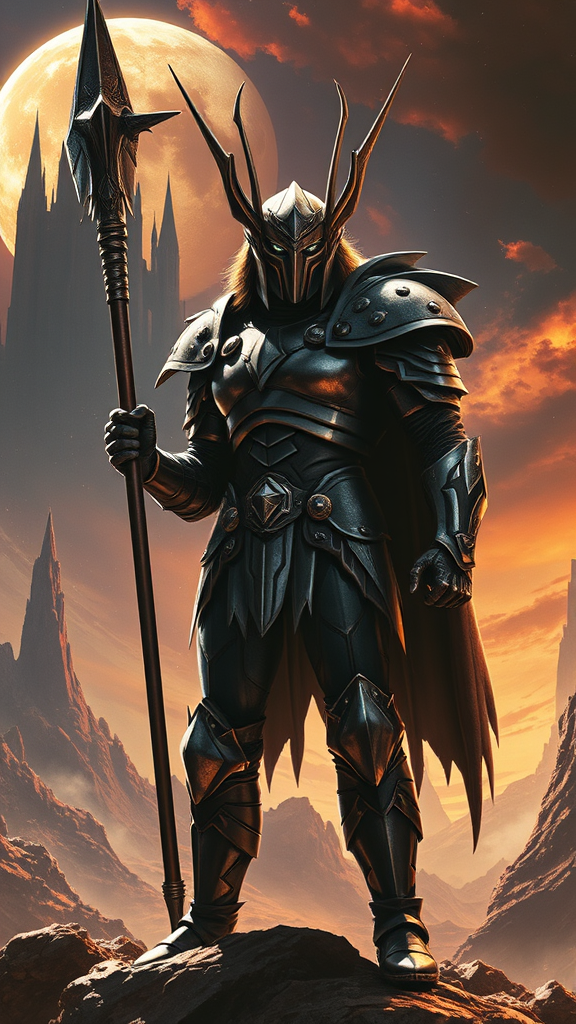 A dynamic portrayal of Colwyn, the gallant hero from the movie 'Krull', is depicted with emphasis on his distinctive armor and the iconic Glaive weapon. Standing resolute against the otherworldly landscape of planet Krull, the scene captures the stark, craggy terrains and towering castle silhouettes that define this alien world. The atmosphere is imbued with an adventurous spirit, emphasizing the hero's unwavering determination and the perilous beauty of Krull. Styled in a cinematic poster art format, the composition is enriched with sharp, dynamic lines and a dramatic play of light and shadow, evoking the high fantasy essence of '80s movie posters. Elements of hyperrealism bring depth to the vibrant interplay of light and shadow, subtly reimagining the classic aesthetic while maintaining the core essence of the scene.