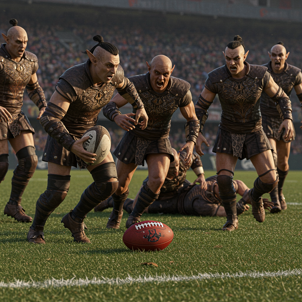 A dynamic, realistic photograph set on a fantasy football field featuring elfs and orks with intricately detailed skin textures in a full-body shot. The scene captures the energy of a rugby-esque match, emphasizing the vibrant colors and unique characteristics of each player. The rugby ball appears worn yet authentic, surrounded by intensely detailed characters. In the background, the playful chaos of a fantasy match unfolds with exaggerated gestures and expressions, highlighting the drama of the scene. The overall composition is sharp and vivid, emphasizing contrast and depth with a cinematic quality and creative lighting that accentuates the drama and excitement of the fantasy world.
