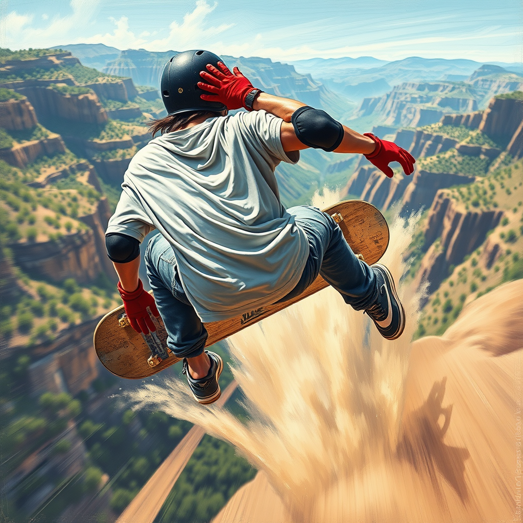 A dynamic, rough painting captures the thrill of an expert skateboarder racing downhill on an extreme skate mountain. The skater's back is seen as they soar with incredible speed. They wear a sleek black helmet and a loose, white T-shirt that flutters in the rushing air. Their denim jogger pants and black knee pads add to their stylish yet rugged look. Vibrant red protective gloves stand out as they grip the longboard, while Nike SB skate shoes maintain a firm connection to the deck. Fluttering dust trails behind, highlighting the breathtaking sense of speed. The mountain backdrop is alive with canyons and lush nature, illustrating the skater's wild ride through this awe-inspiring landscape. The artwork, raw and professional, invokes the adrenaline-filled essence of the moment.