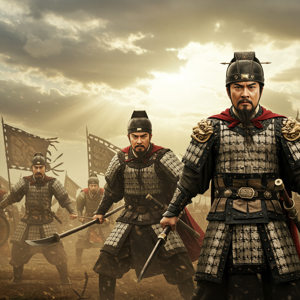 A dynamic scene capturing Ancient Chinese generals on the battlefield, with a close-up perspective as if taken from a hand-held device, highlighting their intricate armor and fierce expressions. The generals are poised with traditional weapons, surrounded by a backdrop of dust and chaos, with banners waving in the wind, and golden sun rays breaking through a cloudy sky, casting dramatic shadows across the landscape. Subtle expressions of determination and strategy fill their faces as they lead their troops into battle, embodying both historical grandeur and the timeless spirit of leadership.