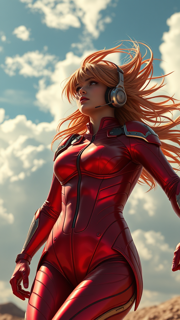 A dynamic scene capturing Asuka Langley Souryuu commanding attention, her signature red bodysuit gleaming under the open sky, hair dancing wildly in the wind. An advanced interface headset sits snugly, enhancing her fierce determination. The backdrop of expansive skies and hurried clouds adds to the intensity of the moment.