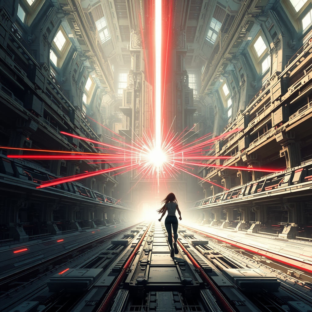 A dynamic scene depicting a girl in a form-fitting jumpsuit navigating the vast interiors of a spaceship, inspired by Tsutomu Nihei's aesthetic. The setting is reminiscent of Sidonia no Kishi, characterized by towering structures and immense spaces. In the center, a colossal laser generator dominates, emanating beams that stretch towards the sky. The environment is a multi-layered space with intricate details, showcasing the complexity of futuristic technology. Energy clots pulse around the generator, casting vibrant flashes of light that signify acceleration and speed. The anime-influenced design is enriched with hyper-detail, embodying manga graphics in super-resolution. This first-person perspective captures the essence of a high-definition, sci-fi universe in an 8K resolution, where every element pulses with life and futuristic allure.