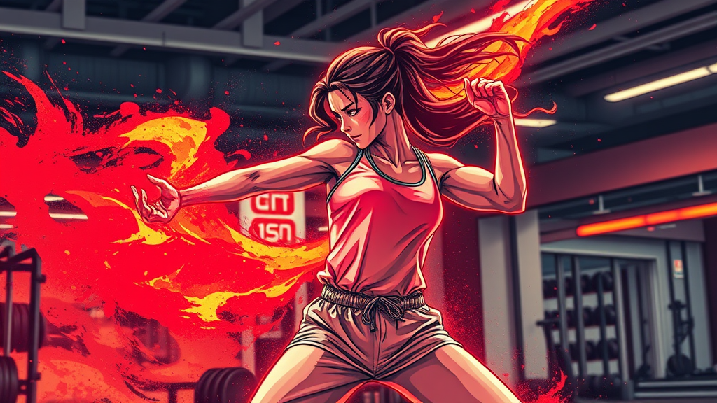 A dynamic scene featuring a fit woman in a gym, emphasizing her strength and agility. Her movements are as powerful and graceful as a galactic force, with an intensity akin to fire. The background features elements inspired by satellite imagery, offering a broader perspective of her energy and focus. The artistic style channels the bold and fluid lines of Yoji Shinkawa, with accents of neon red color illuminating her form, highlighting her determination and passion. She wears a comfortable cotton outfit that allows for a full range of motion, seamlessly blending style with functionality in this vivid, stylized representation.