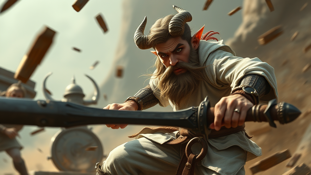 A dynamic scene featuring a full male halfling, armed with clever tactics, skillfully engaged in combat with an adversary wielding a massive weapon. Inspired by Pipin from Dragonlance, the courageous halfling exhibits sharp intellect and agile movements. The setting captures a sense of adrenaline and tension, highlighting detailed features such as his striking face and expressive eyes. Rendered in a photorealistic style with 8k resolution, the artwork embodies a masterpiece quality inspired by the styles of Jeremy Mann, Sandra Chevrier, and Maciej Kuciara. The image boasts realistic lighting and shadows, enhancing the lifelike texture of the scene. This narrative is supported by creative elements, including an unusual number of arms and fingers, a distinct beard, and fantastical horns, yet dressed in an unassuming white robe and pants. Subtle artistic adjustments add layers of depth and intrigue, maintaining the essence of a battle ready halfling engaged in epic combat.