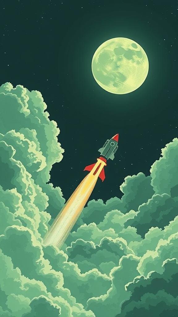 A dynamic scene of a rocket slicing through clouds into the vastness of space, with the serene moon as a backdrop, envisioned in the artistic style of Laurie Greasley and James Gilleard with a touch of Genshin Impact aesthetics. The image showcases a trending Pixiv Fanbox appeal, utilizing an acrylic palette knife technique to achieve a minimalistic composition with few colors, predominantly green. The background maintains simplicity, drawing inspiration from trending pieces on ArtStation and Devinart, characterized by low-detail elements. The artwork is of high quality, rendered in 8k UHD with HDR, ensuring vivid clarity and richness without any flaws such as disfigurements or mutations. The piece is devoid of artifacts like watermarks, logos, or any text, maintaining a clean, professional presentation.