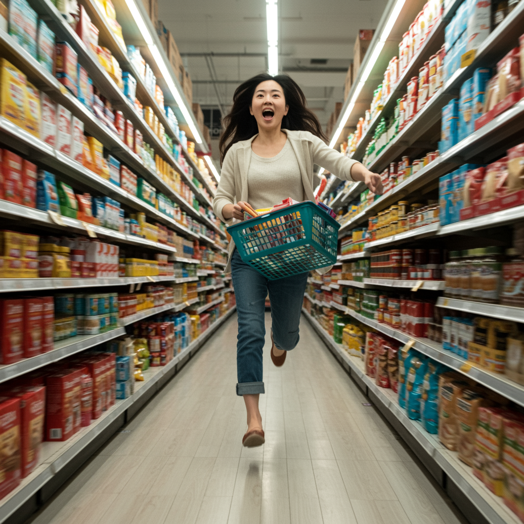 A dynamic scene unfolds as a woman races down the aisle of a bustling supermarket with an exuberant energy, in the style of Zhang Jingna's ethereal touch combined with playful chaos. The environment is infused with photo-realistic hyperbole reminiscent of Yasuo Kuniyoshi's vivid artistry, capturing the essence of Jessica Drossin's skillful manipulation of light and texture. Each detail is highlighted from a dramatic low-angle, emphasizing exaggerated expressions of astonishment and delight on the woman's face. The shelves blur into streaks of colorful chaos, adding a whimsical edge to the image, embodying a lively and spirited atmosphere.