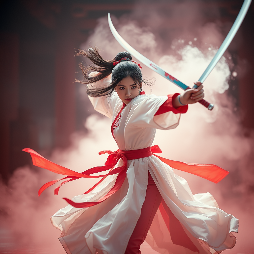 A dynamic scene unfolds with a girl wielding a sword in the background, capturing the ethereal style of Xiaofei Yue. The image is awash in soft white and vibrant red hues, with colorful costumes adding a cinematic flair. It resembles a movie still, embodying the essence of weathercore with its atmospheric elements. The composition is action-packed and energetic, as the girl moves with grace and intensity. The atmosphere is filled with a sense of motion and a captivating aura, enveloping the viewer in a vibrant, otherworldly experience.