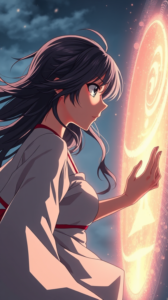 A dynamic side view of a female anime-style character, her hand reaching out towards a luminous, magical portal that bridges her world with reality. Her expression is a mix of curiosity and determination. The scene is rendered in manga style, capturing intricate details with photorealistic precision. The portal emanates a mystic glow that casts intricate shadows and highlights on her detailed attire. Her hair flows gracefully, caught in the enchanting breeze of the otherworldly transition. The overall composition aims for a highly detailed, immersive experience with an 8k resolution, maintaining a 3:2 aspect ratio.