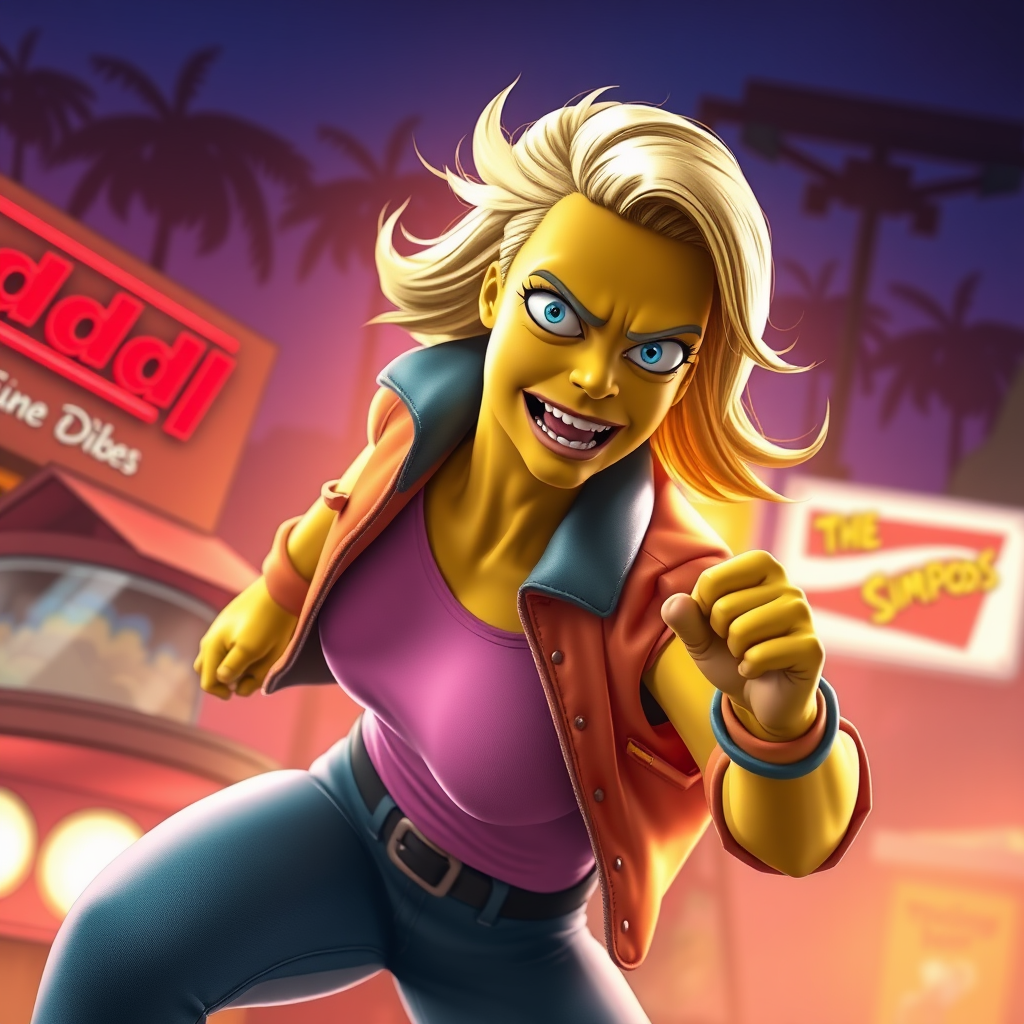 A dynamic still image of Margot Robbie styled as a character from The Simpsons, crafted in Matt Groening's signature design. The character is shown in a full-body action pose, exuding an epic and cinematic aura. The background complements the character’s vibrant personality, featuring dynamic rim lighting and a meticulously color-graded palette. The scene is enriched with light shading and detailed elements, presenting a vivid and colorful depiction in 4k quality, capturing the essence of The Simpsons universe with a touch of creativity.