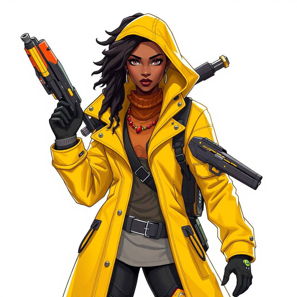 A dynamic woman in a vibrant yellow coat, armed with sleek, futuristic weaponry, embodies a blend of Loba Andrade from Apex Legends and a reimagined Lucio, as if transported into the Overwatch universe. Her style merges Apex Legends' edgy concept art with the lively ingenuity of Afrofuturism anime. Her presence echoes the formidable grace of Senna from League of Legends, yet her armor design draws inspiration from Brigitte's robust aesthetic in Overwatch. She stands as a valorant-like sentinel, with striking features and a bold stance, representing a seamless integration of various realms into a singular, captivating character.