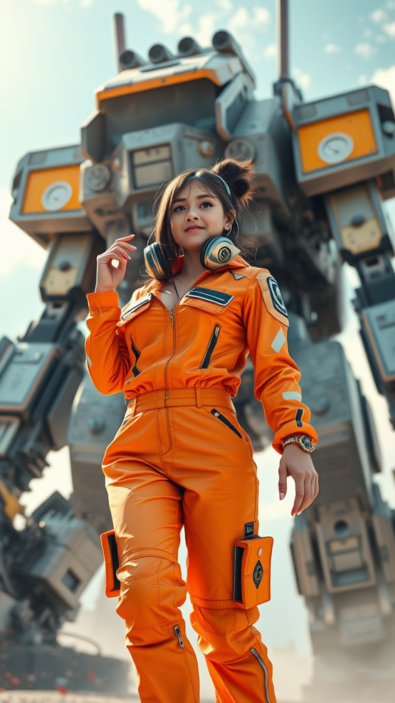 A dynamic young female DJ in a futuristic, elaborately designed orange jumpsuit stands confidently with headphones in hand. The scene is reminiscent of a cinematic movie poster, blending vibrant anime and manga graphics. Behind her looms an aged, towering Mech, set against a bright, sunny sky. The atmosphere is infused with the energy of music and sound, depicted in the background. The colors are vivid and radiant, brought to life with high detail using offset printing techniques. The poster exudes happiness and a sense of natural light, boasting an 8K, HD quality in CMYK, capturing both the futuristic and joyful essence of the scene.