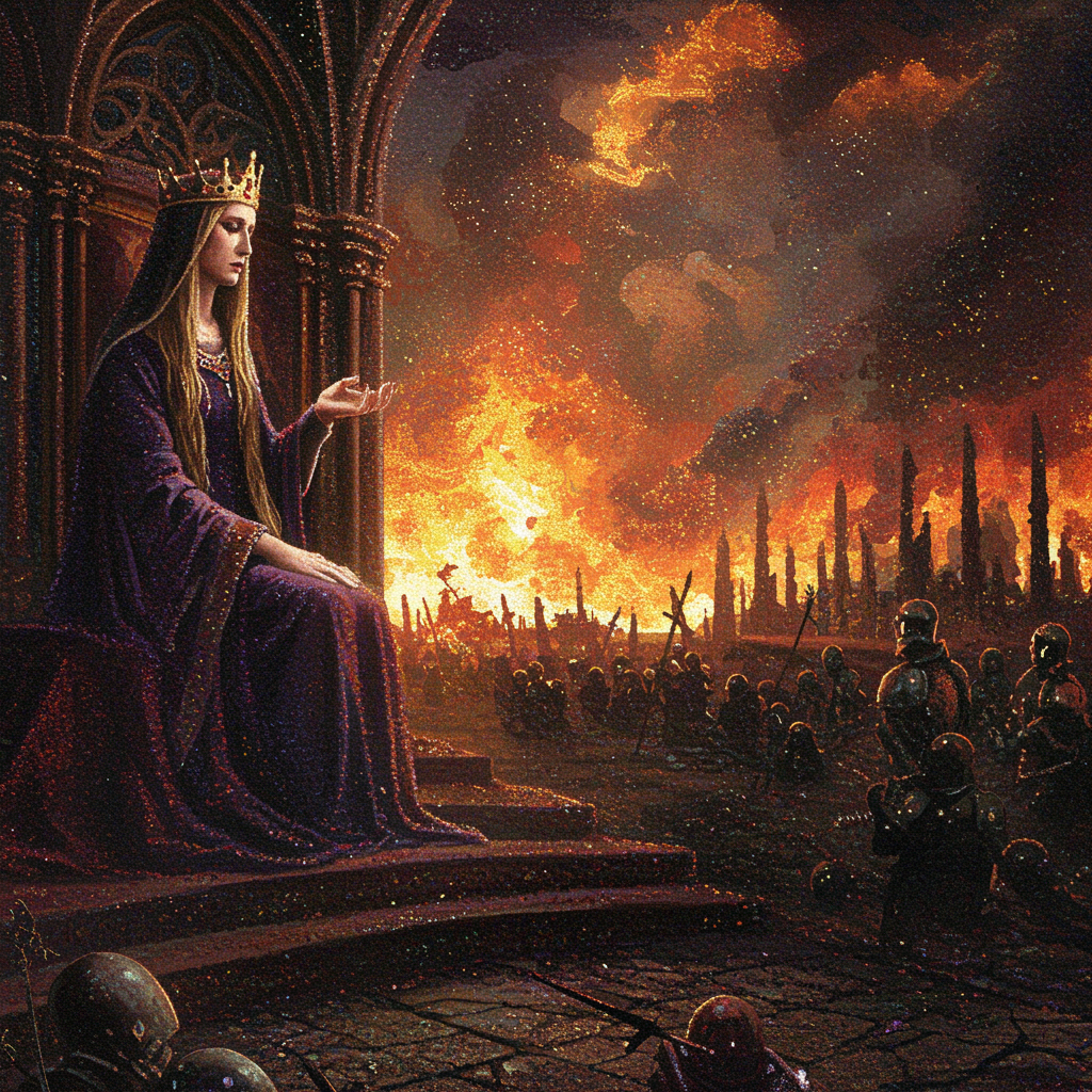A dystopian dreamscape in the style of impressionist pointillism, presenting a gothic and dramatic portrait of a queen lamenting over a kingdom scorched by fire, reminiscent of classical baroque religious art. The atmosphere is dark, mysterious, and unsettling, yet rich with dramatic and ornate details. The entire composition is crafted with tiny, vibrant, meticulously detailed dots of color, evoking a medieval ambiance with shimmering surfaces and textures. The piece features loose brushstrokes, vibrant hues, and a play of light and shadow that captures emotion over form. It evokes a desolate, post-apocalyptic, and somber mood, yet remains deeply detailed. The scene is surreal, ethereal, dreamlike, and fantastical, meticulously detailed, capturing an otherworldly essence.