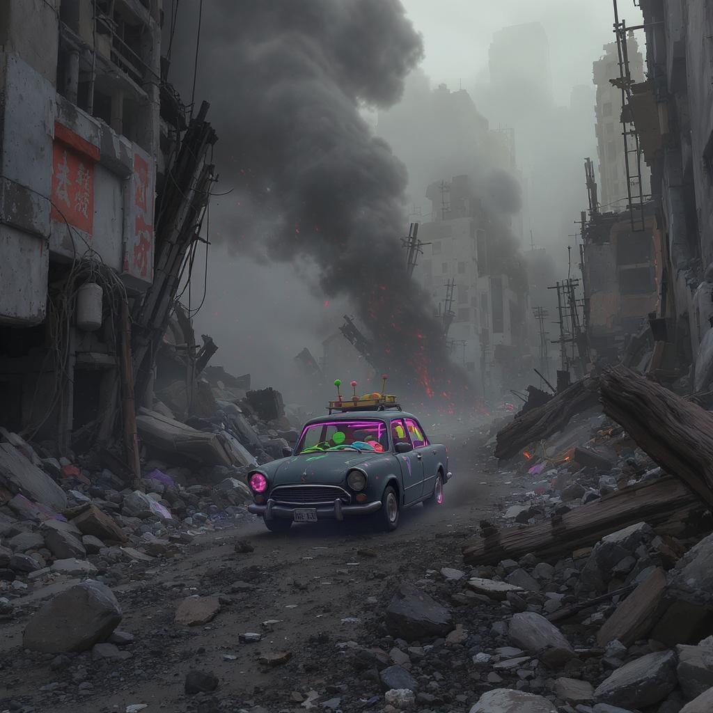 A dystopian vision of a city's engine, a bleak and post-apocalyptic landscape emerges, where somber shadows loom over dramatic, highly detailed ruins. In the heart of the crumbling metropolis, an odd car navigates through chaos - simple yet ugly, with deformed edges that echo the noisy discord of this world. The scene is blurred by a haze of uncertainty, marked by low contrast tones that clash with unexpected bursts of cheerfulness. Despite the desolation, an optimistic spirit weaves vibrant colors through the decay, painting a tapestry of hope amidst the rubble.