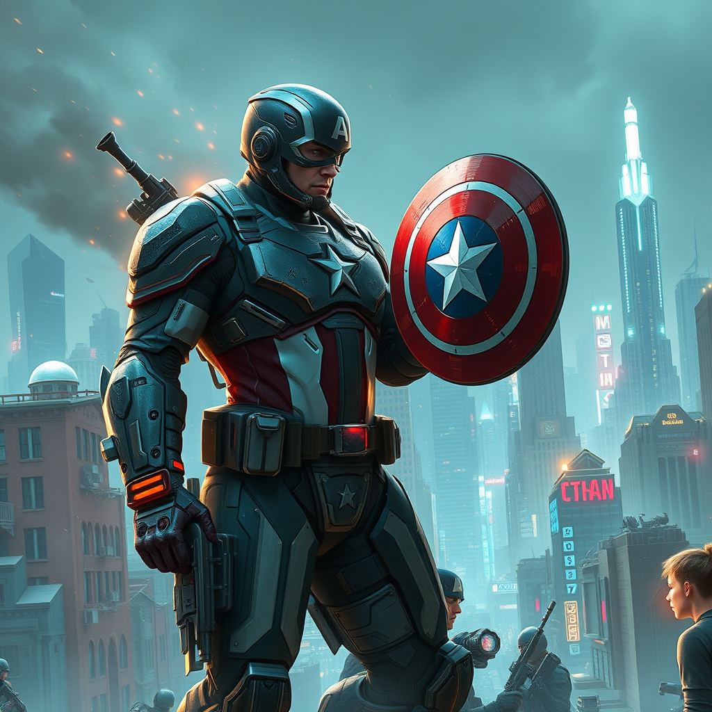 A dystopian world where a cyber-enhanced dictator clad in a corrupted version of Captain America's armor reigns over Neon City, implementing strict control with an iron fist. His shield, now a deadly piece of advanced tech, symbolizes the oppression of a once-free society. As he patrols the cityscape, augmented with high-tech combat enhancements, he enforces his rule with unwavering precision, casting a long shadow over the sprawling metropolis as resistance fighters plot in the shadows, seeking to restore freedom to the people.