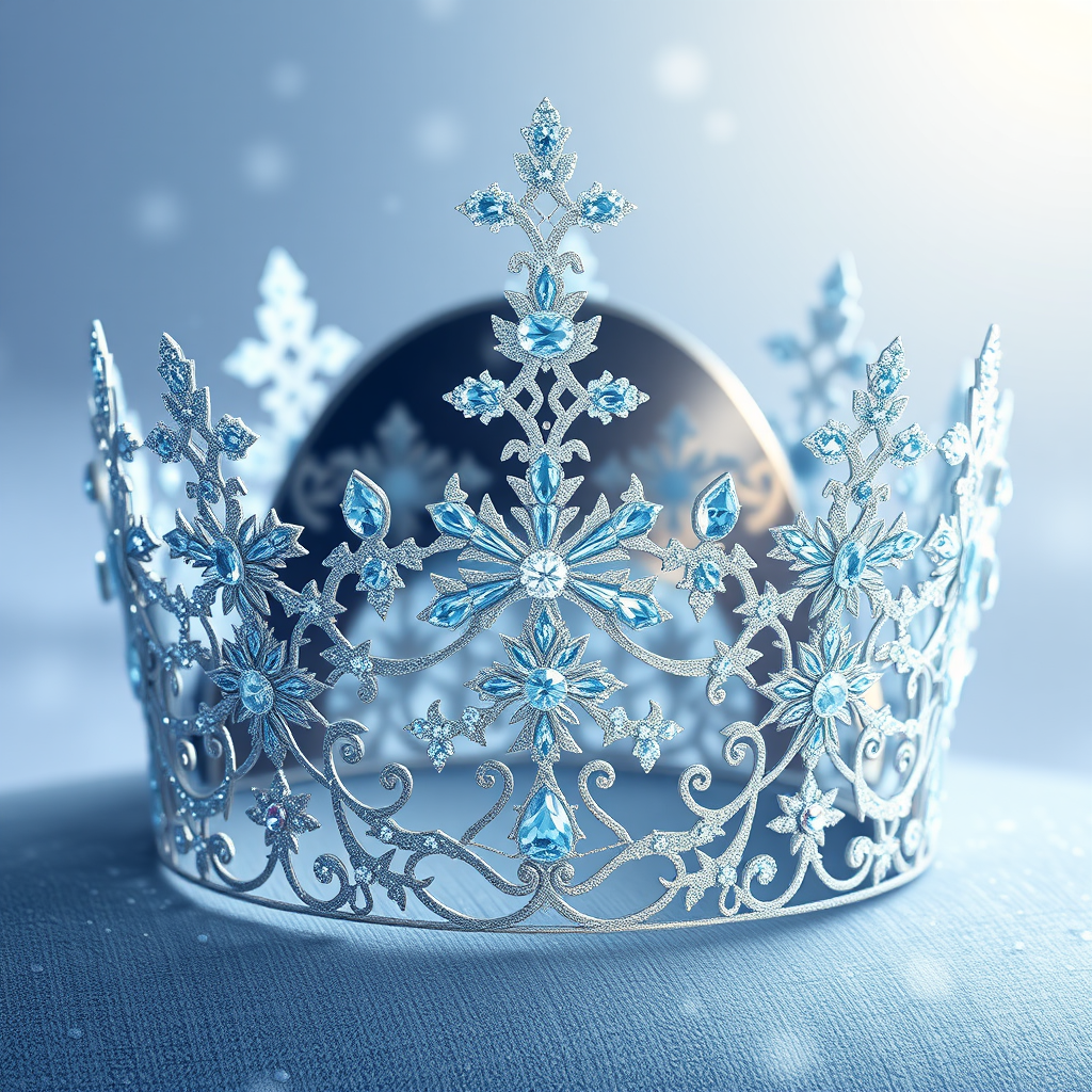 A enchanting princess crown, intricately designed with inspiration from fairytales, reminiscent of Disney's Frozen art style. The masterpiece reflects a Philippe Starck touch, adorned with delicate ice-blue and silver patterns that sparkle and glitter in the light. The jewels, carefully set into the design, shimmer like frosted stars against a winter sky, casting a soft, magical luminescence. The crown, a blend of elegance and whimsy, features gentle curves and pointed peaks, embodying both regal grace and snow-kissed charm.
