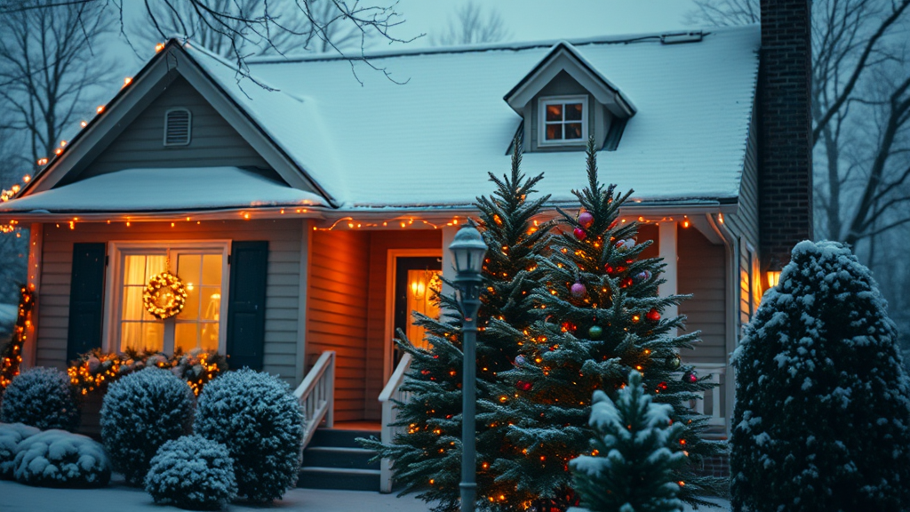A enchanting winter scene of a house adorned for Christmas, featuring glowing string lights, a snow-covered roof, and a beautifully decorated evergreen tree in the front yard, with gentle snowfall adding a touch of cinematic magic in HD quality.