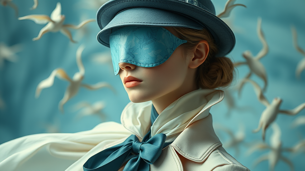 A enigmatic spy adorned with a gentle blue camouflage across her face, reminiscent of delicate porcelain craftsmanship, displays elegant and timeless fashion. Her form, seemingly sculpted from mythical creatures, moves with flowing grace and is accented by pastel hues. The scene unfolds with an Oliver Jeffers-inspired surreal background, adding layers of intrigue and whimsy to the composition, evoking a sense of wonder and mystery within a 9:16 portrait.