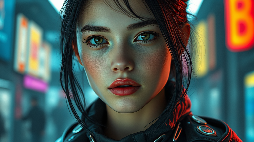 A European young girl with a strikingly perfect face, featuring a sharp chin and exquisite details, is depicted in a futuristic setting. She wears a storm rain movie jacket coat, embodying a unique blend of sci-fi fashion and royal attire. The scene channels the aesthetics of cyberpunk and neotokyo, with synth-wave and low-emission neon influences reminiscent of a Bladerunner movie scene. Dramatic lighting enhances the hyperrealism, captured with a f1.6 lens for rich colors and lifelike texture, producing a highly detailed, ultra high resolution 8K image. The portrait reflects hyper-realistic textures, a testament to professional photography and physics-based rendering. With influences from artists like Ismail Inceoglu, Dragan Bibin, Hans Thoma, and Greg Rutkowski, the result is a seamless blend of digital art and illustration, avoiding common pitfalls of distorted anatomy or unrealistic features.