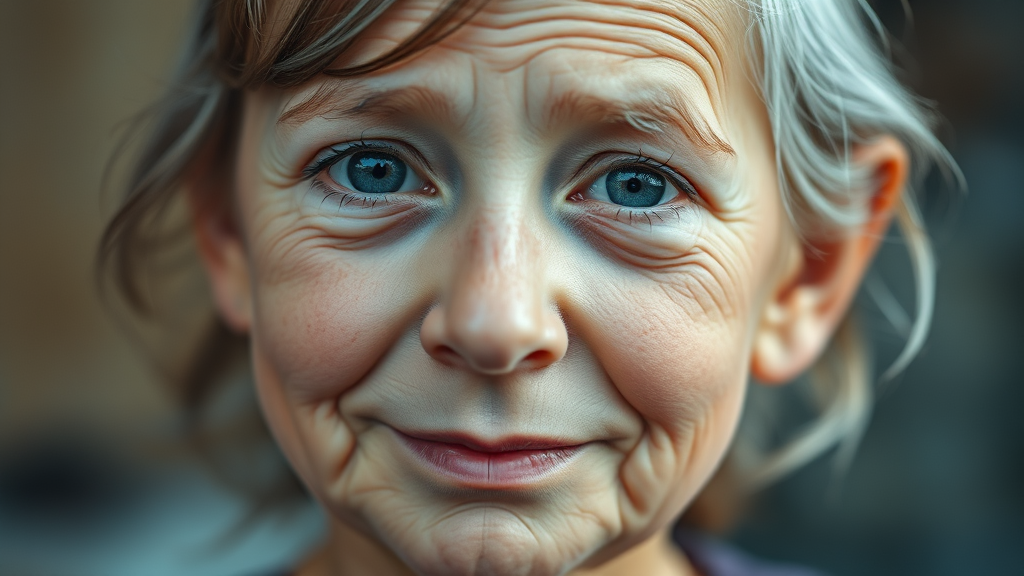 A face blending the youthful innocence of a young girl with the wisdom and age of an elderly person in their eighties, capturing the contrast between smooth skin and age-worn wrinkles, framed by a harmonious mix of vibrant, youthful colors and muted, serene tones, set against a 4:5 aspect ratio, embracing a sense of timeless beauty and the passage of time through a softly blurred background that hints at life's journey.