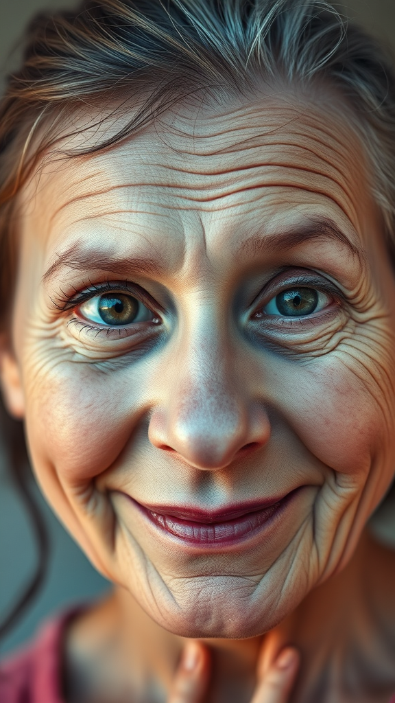 A face blending youthful innocence and timeless wisdom, seamlessly merging features of a young girl and an elderly person in their eighties; both sides reflecting contrasting stories of life, with delicate skin transitioning into deeply lined wrinkles, bright curious eyes met by ones filled with experience, a shared soft smile bridging generations, set against a harmonious, dream-like background that captures the passage of time through subtle gradients and complementary colors, emphasizing the beauty of life's continuum.