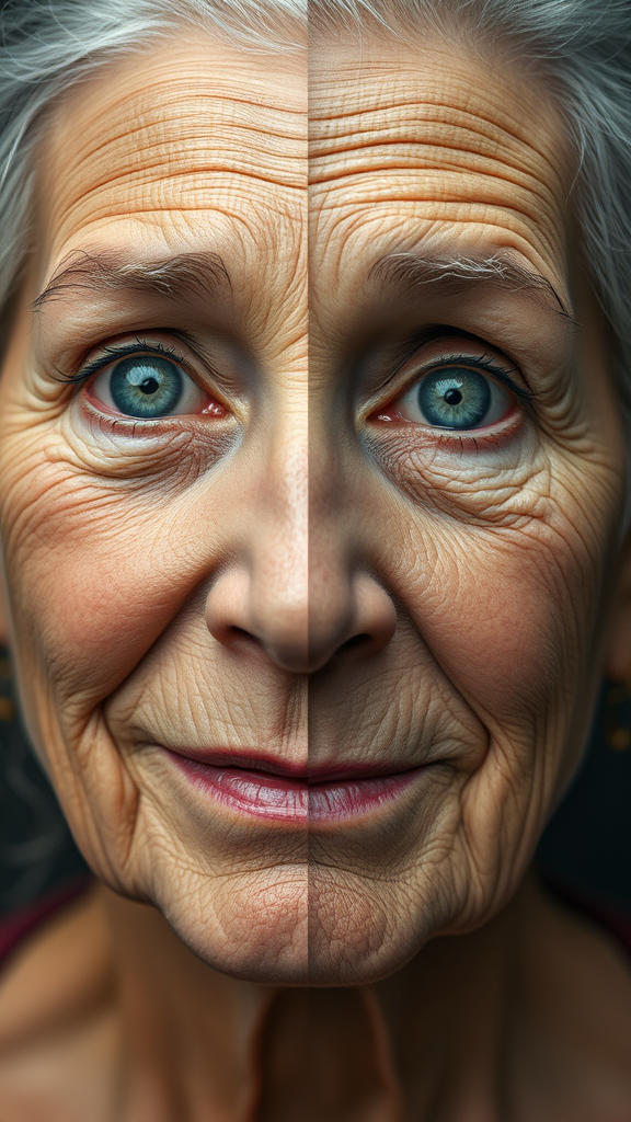 A face with a seamless blend, one half depicting a vibrant young girl with bright, joyful eyes and soft, smooth skin, the other half showcasing the wisdom and dignity of an elderly person in their eighties with deep-set, thoughtful eyes and a textured, weathered complexion; the juxtaposition of youthful exuberance and aged experience, captured in a harmonious and surreal portrait.