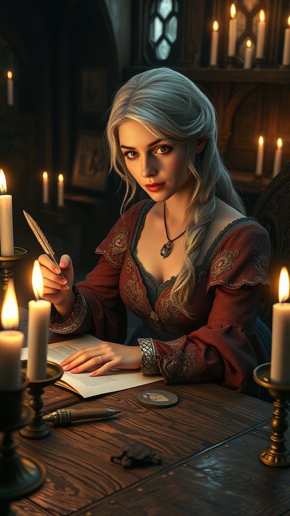 A fair-haired woman in an ornate medieval gown sits at an ancient wooden desk, her quill gliding gracefully across the parchment under the soft glow of numerous flickering candles, creating an atmosphere of mystic allure. This scene, reminiscent of fantasy art by Wojtek Fus and Magali Villeneuve, captures a moment of focused creativity akin to characters like Ciri from the Witcher series. The detailed rendering highlights her serene expression and the intricate details of her dress, echoing the finest works on Behance and ArtStation. Set in a richly textured 4k fantasy art style, this image embodies the essence of epic fantasy art found in immersive fantasy games, presenting a stunning and enchanting character portrait.